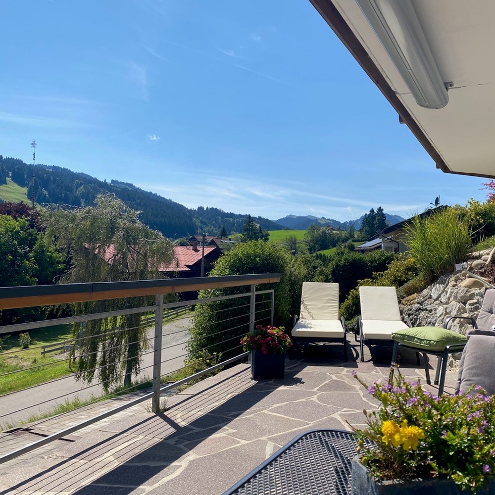 In unserem ökologisch erbauten Allgäuer Holzhaus frei gelegen an einem Südhang mit Blick auf die Berge und den Ortskern, können Sie den ganzen Tag Sonne genießen.
